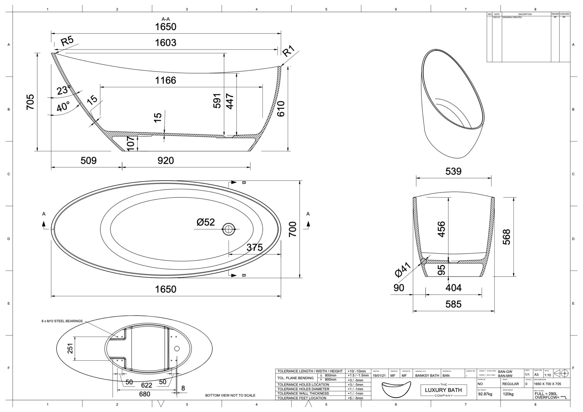 - Water capacity for full freestanding bathtub: 290 litres