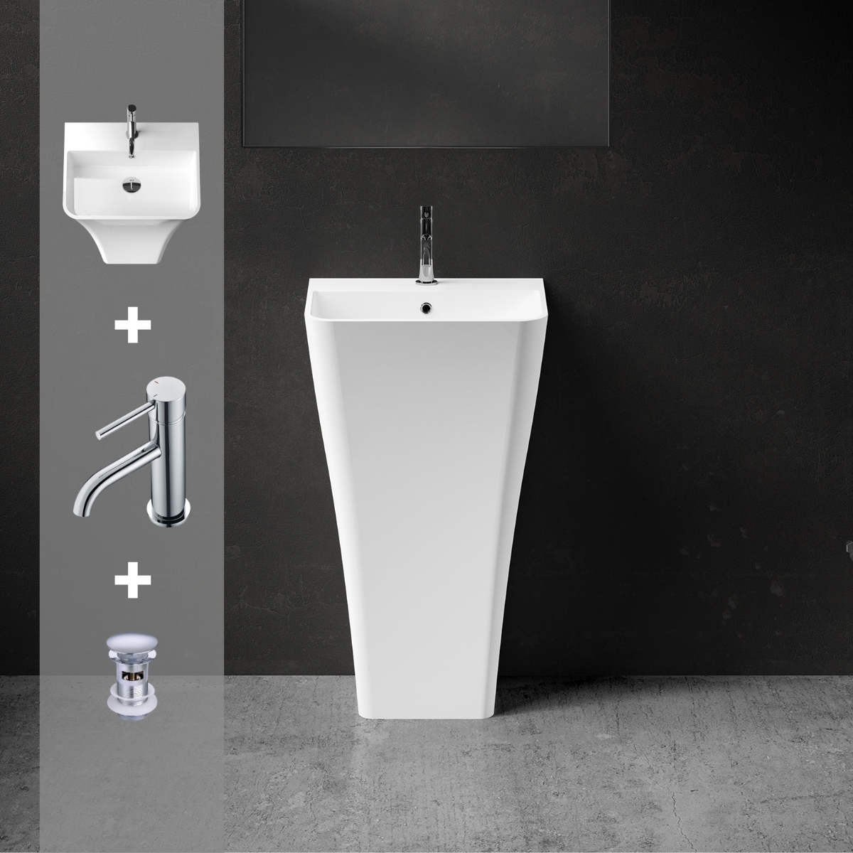 The Haydon stone freestanding basin creates a stunning focal point for a contemporary bathroom, cloakroom or downstairs toilet room. The modern pedestal for the rectangular stone basin is exquisite; rounded corners and gentle contours soften the aesthetic and confirm the Haydon as a statement of unparalleled luxury.