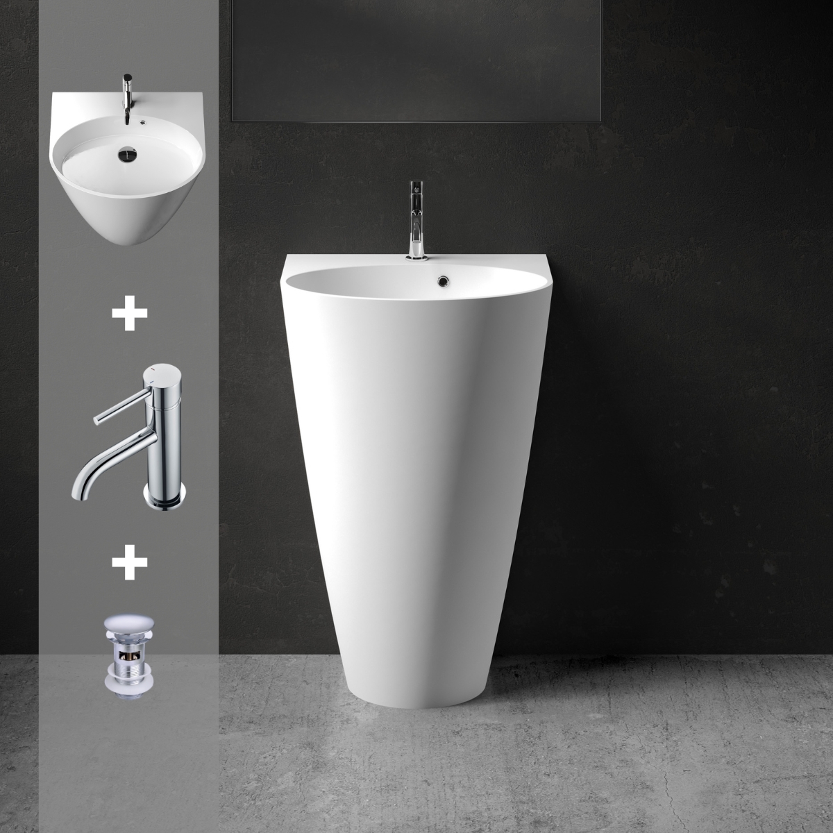 The Marlow stone freestanding basin is the epitome of luxurious elegance and creates a stunning focal point for any contemporary bathroom, cloakroom or downstairs toilet room. From the generous oval bowl, the tapered structural design sits snug against the wall and continues to the floor providing a smooth and rounded silhouette to keep pipework where it should be – hidden.