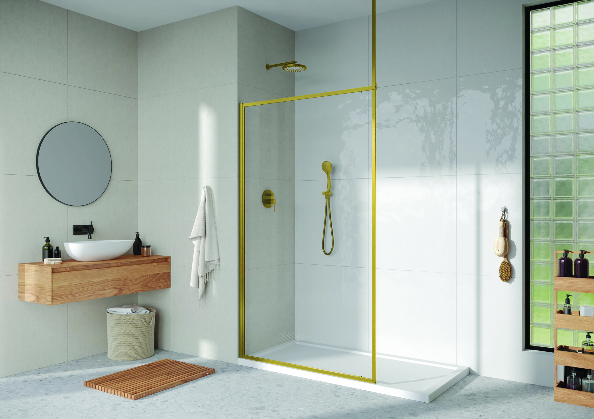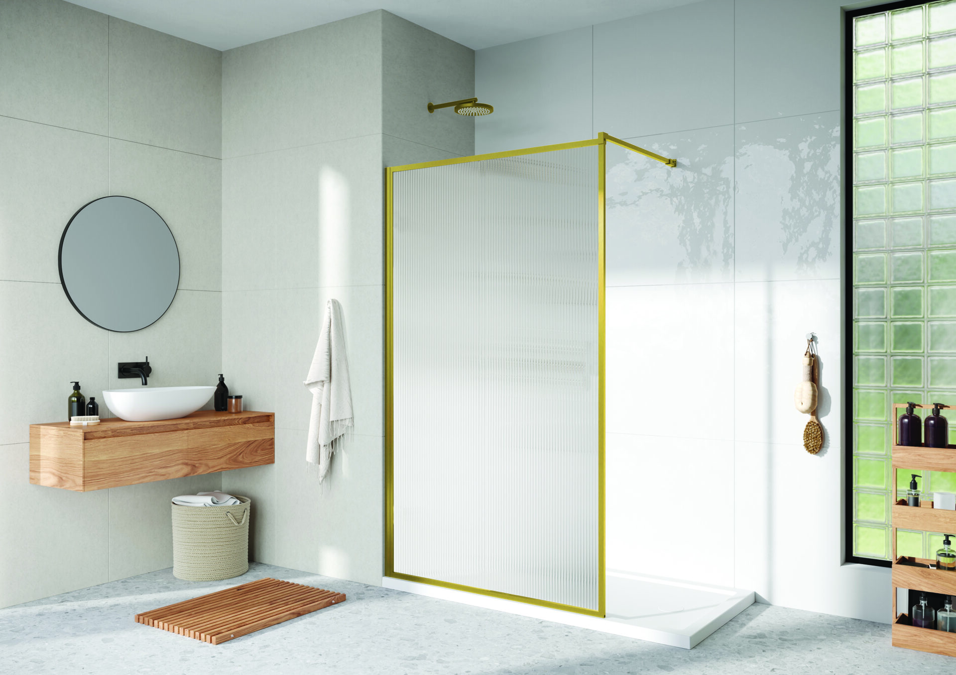 Choose from 3 different finishes, chrome, matt black and brushed brass, and 2 glass options, clear, or fluted glass for extra privacy.