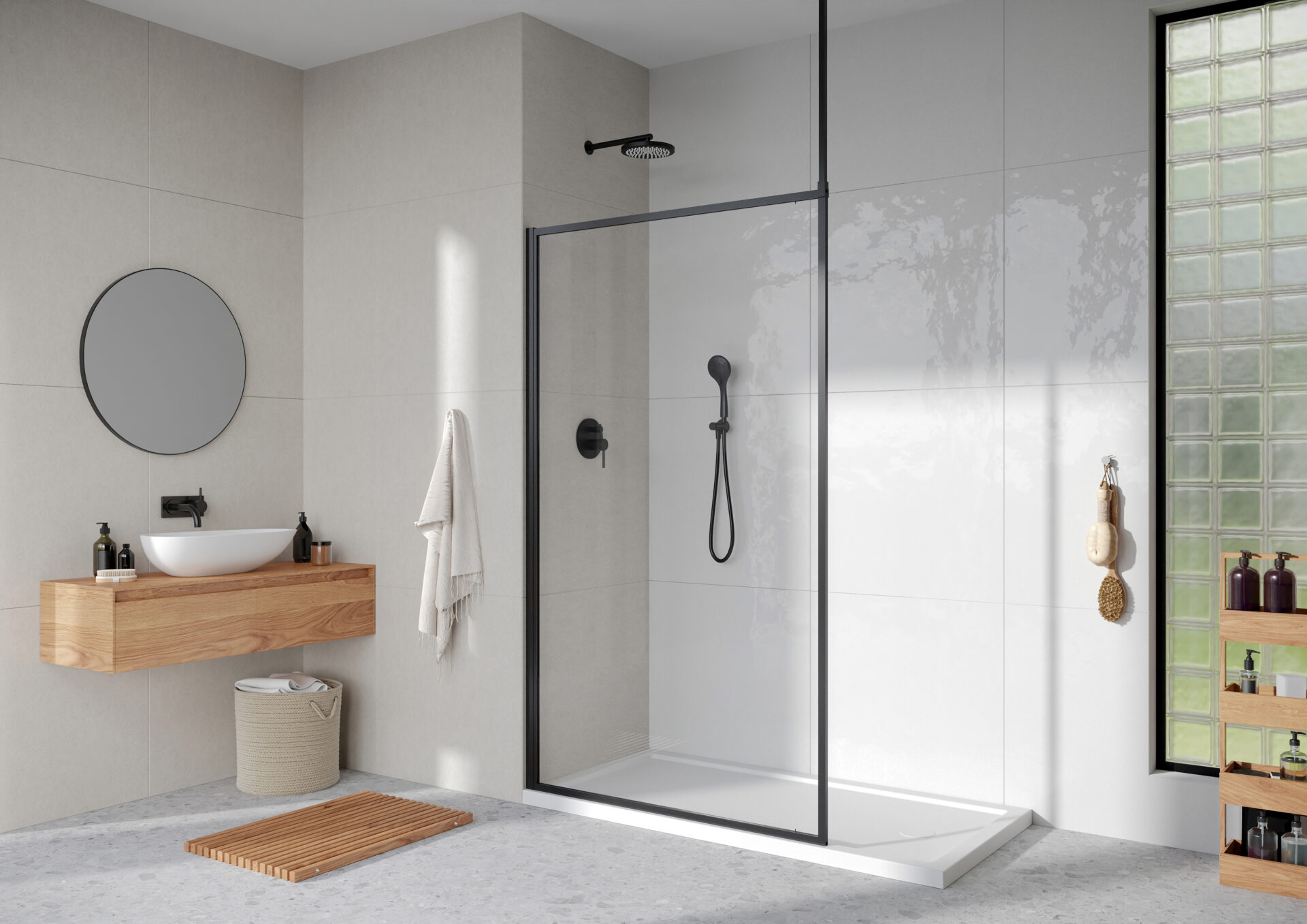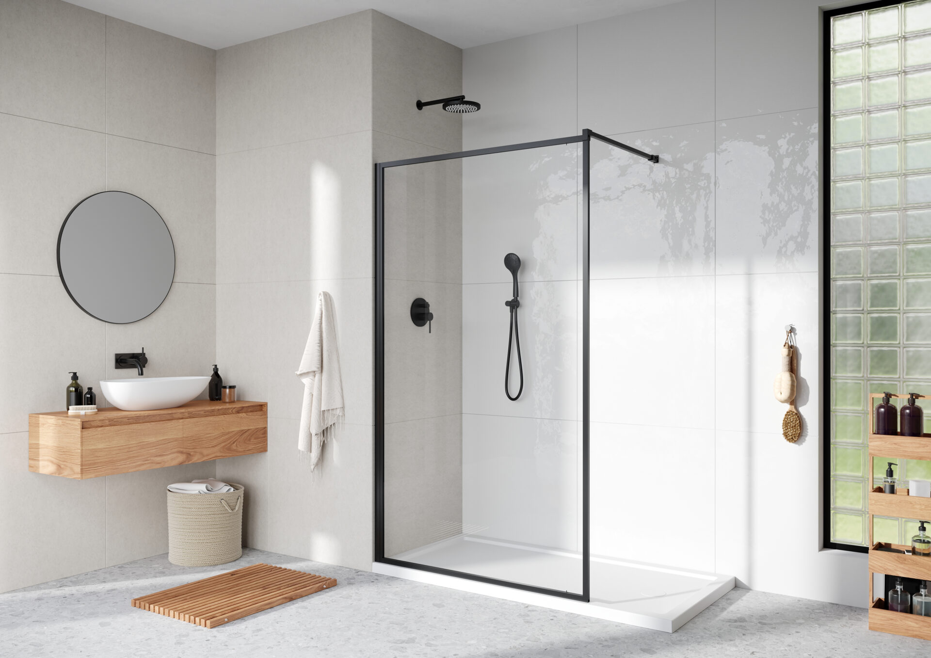 Choose from 3 different finishes, chrome, matt black and brushed brass, and 2 glass options, clear, or fluted glass for extra privacy.